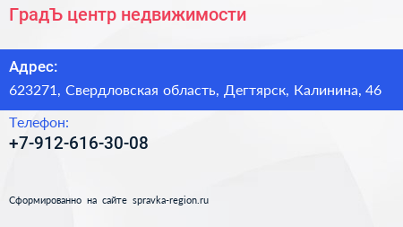ГрадЪ, центр недвижимости по адресу 623271, Свердловская область, Дегтярск, Калинина, 46 в дальнейшем Организация, размещена в следующих категориях: