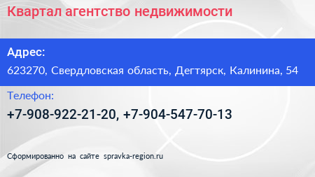 Квартал, агентство недвижимости по адресу 623270, Свердловская область, Дегтярск, Калинина, 54 в дальнейшем Организация, размещена в следующих категориях: