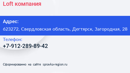 Loft, компания по адресу 623272, Свердловская область, Дегтярск, Загородная, 28 в дальнейшем Организация, размещена в следующих категориях: