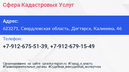 Сфера Кадастровых Услуг по адресу 623271, Свердловская область, Дегтярск, Калинина, 46 в дальнейшем Организация, размещена в следующих категориях: