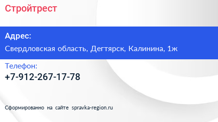 Стройтрест по адресу Свердловская область, Дегтярск, Калинина, 1ж в дальнейшем Организация, размещена в следующих категориях: