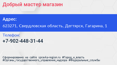Добрый мастер, магазин по адресу 623271, Свердловская область, Дегтярск, Гагарина, 1 в дальнейшем Организация, размещена в следующих категориях: