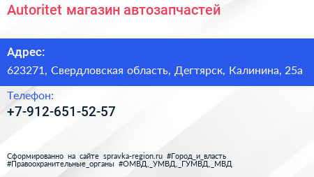 Autoritet, магазин автозапчастей по адресу 623271, Свердловская область, Дегтярск, Калинина, 25а в дальнейшем Организация, размещена в следующих категориях: