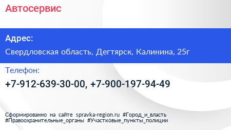 Автосервис по адресу Свердловская область, Дегтярск, Калинина, 25г в дальнейшем Организация, размещена в следующих категориях: