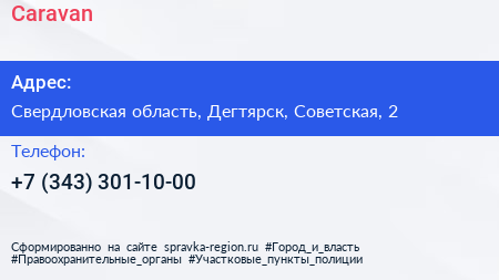 Caravan по адресу Свердловская область, Дегтярск, Советская, 2 в дальнейшем Организация, размещена в следующих категориях: