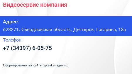 Видеосервис, компания по адресу 623271, Свердловская область, Дегтярск, Гагарина, 13а в дальнейшем Организация, размещена в следующих категориях: