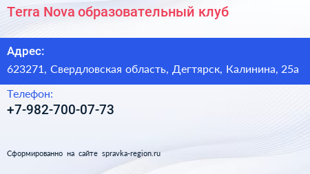 Terra Nova, образовательный клуб по адресу 623271, Свердловская область, Дегтярск, Калинина, 25а в дальнейшем Организация, размещена в следующих категориях: