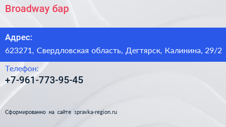 Broadway, бар по адресу 623271, Свердловская область, Дегтярск, Калинина, 29/2 в дальнейшем Организация, размещена в следующих категориях: