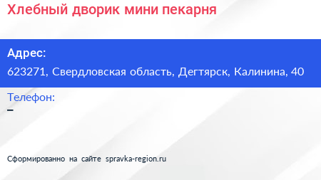 Хлебный дворик, мини-пекарня по адресу 623271, Свердловская область, Дегтярск, Калинина, 40 в дальнейшем Организация, размещена в следующих категориях: