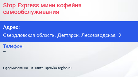 [Stop] Express, мини-кофейня самообслуживания по адресу Свердловская область, Дегтярск, Лесозаводская, 9 в дальнейшем Организация, размещена в следующих категориях: