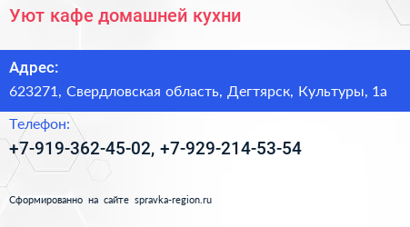 Уют, кафе домашней кухни по адресу 623271, Свердловская область, Дегтярск, Культуры, 1а в дальнейшем Организация, размещена в следующих категориях: