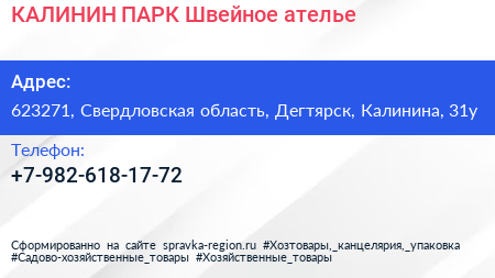 КАЛИНИН ПАРК, Швейное ателье по адресу 623271, Свердловская область, Дегтярск, Калинина, 31у в дальнейшем Организация, размещена в следующих категориях: