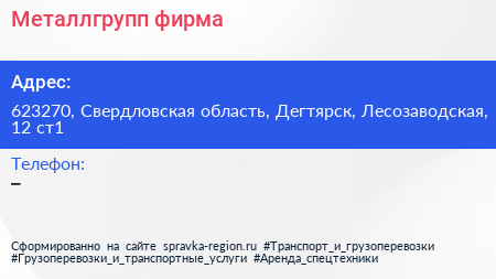 Металлгрупп, фирма по адресу 623270, Свердловская область, Дегтярск, Лесозаводская, 12 ст1 в дальнейшем Организация, размещена в следующих категориях: