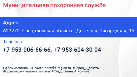 Муниципальная похоронная служба по адресу 623272, Свердловская область, Дегтярск, Загородная, 15 в дальнейшем Организация, размещена в следующих категориях: