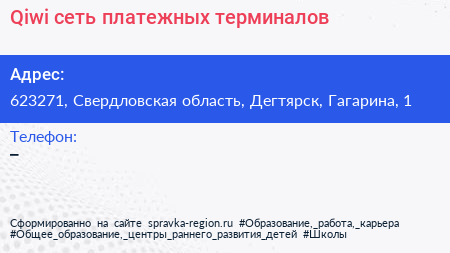 Qiwi, сеть платежных терминалов по адресу 623271, Свердловская область, Дегтярск, Гагарина, 1 в дальнейшем Организация, размещена в следующих категориях: