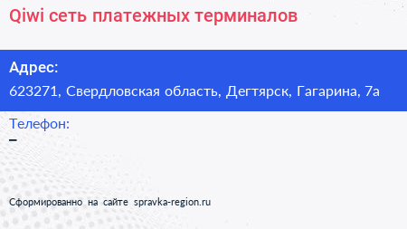 Qiwi, сеть платежных терминалов по адресу 623271, Свердловская область, Дегтярск, Гагарина, 7а в дальнейшем Организация, размещена в следующих категориях: