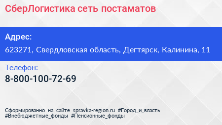 СберЛогистика, сеть постаматов по адресу 623271, Свердловская область, Дегтярск, Калинина, 11 в дальнейшем Организация, размещена в следующих категориях: