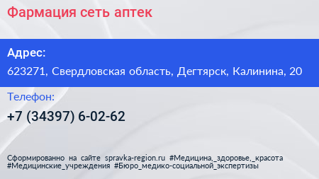 Фармация, сеть аптек по адресу 623271, Свердловская область, Дегтярск, Калинина, 20 в дальнейшем Организация, размещена в следующих категориях: