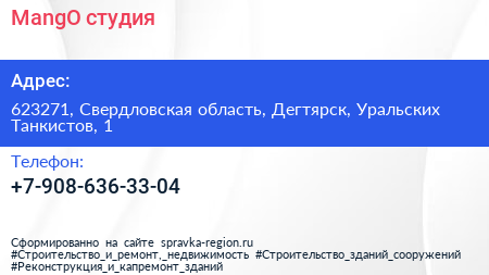 MangO, студия по адресу 623271, Свердловская область, Дегтярск, Уральских Танкистов, 1 в дальнейшем Организация, размещена в следующих категориях: