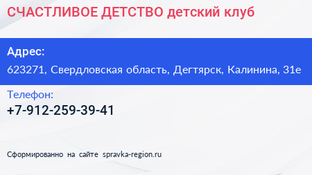 СЧАСТЛИВОЕ ДЕТСТВО, детский клуб по адресу 623271, Свердловская область, Дегтярск, Калинина, 31е в дальнейшем Организация, размещена в следующих категориях: