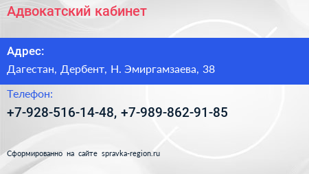 Адвокатский кабинет по адресу Дагестан, Дербент, Н. Эмиргамзаева, 38 в дальнейшем Организация, размещена в следующих категориях: