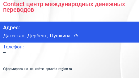 Contact, центр международных денежных переводов по адресу Дагестан, Дербент, Пушкина, 75 в дальнейшем Организация, размещена в следующих категориях: