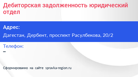 Дебиторская задолженность, юридический отдел по адресу Дагестан, Дербент, проспект Расулбекова, 20/2 в дальнейшем Организация, размещена в следующих категориях: