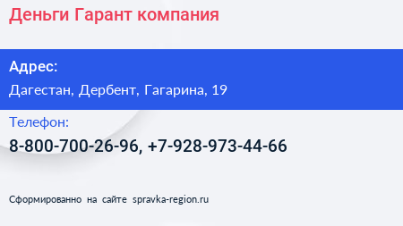 Деньги Гарант, компания по адресу Дагестан, Дербент, Гагарина, 19 в дальнейшем Организация, размещена в следующих категориях: