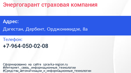 Энергогарант, страховая компания по адресу Дагестан, Дербент, Орджоникидзе, 8а в дальнейшем Организация, размещена в следующих категориях: