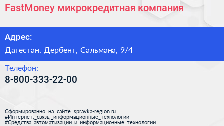 FastMoney, микрокредитная компания по адресу Дагестан, Дербент, Сальмана, 9/4 в дальнейшем Организация, размещена в следующих категориях: