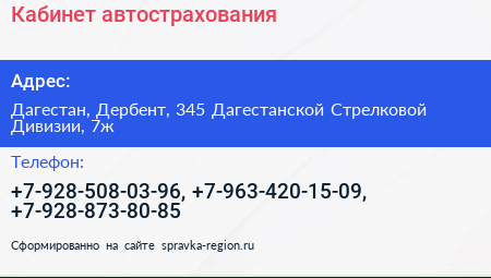 Кабинет автострахования по адресу Дагестан, Дербент, 345 Дагестанской Стрелковой Дивизии, 7ж в дальнейшем Организация, размещена в следующих категориях: