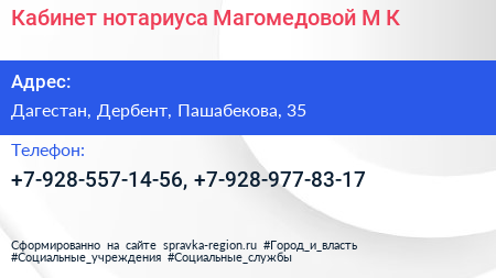 Кабинет нотариуса Магомедовой М.К. по адресу Дагестан, Дербент, Пашабекова, 35 в дальнейшем Организация, размещена в следующих категориях: