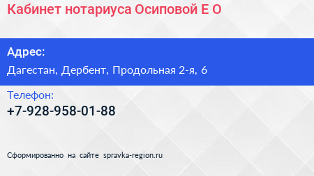 Кабинет нотариуса Осиповой Е.О. по адресу Дагестан, Дербент, Продольная 2-я, 6 в дальнейшем Организация, размещена в следующих категориях: