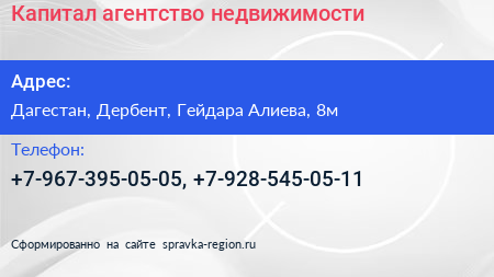 Капитал, агентство недвижимости по адресу Дагестан, Дербент, Гейдара Алиева, 8м в дальнейшем Организация, размещена в следующих категориях: