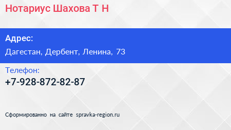 Нотариус Шахова Т.Н. по адресу Дагестан, Дербент, Ленина, 73 в дальнейшем Организация, размещена в следующих категориях:
