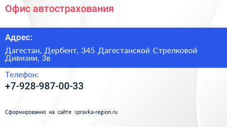Офис автострахования по адресу Дагестан, Дербент, 345 Дагестанской Стрелковой Дивизии, 3в в дальнейшем Организация, размещена в следующих категориях:
