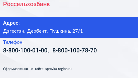 Россельхозбанк по адресу Дагестан, Дербент, Пушкина, 27/1 в дальнейшем Организация, размещена в следующих категориях: