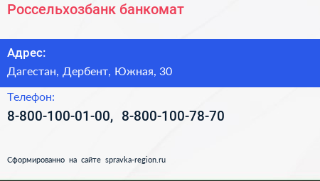 Россельхозбанк, банкомат по адресу Дагестан, Дербент, Южная, 30 в дальнейшем Организация, размещена в следующих категориях: