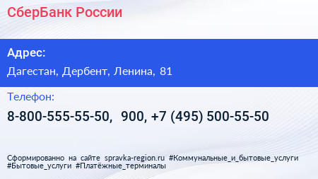 СберБанк России по адресу Дагестан, Дербент, Ленина, 81 в дальнейшем Организация, размещена в следующих категориях:
