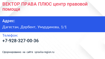 ВЕКТОР ПРАВА ПЛЮС, центр правовой помощи по адресу Дагестан, Дербент, Умурдинова, 1/1 в дальнейшем Организация, размещена в следующих категориях: