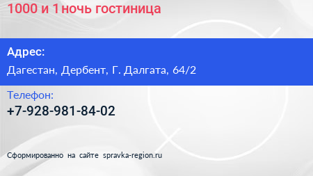 1000 и 1 ночь, гостиница по адресу Дагестан, Дербент, Г. Далгата, 64/2 в дальнейшем Организация, размещена в следующих категориях:
