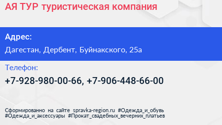 АЯ-ТУР, туристическая компания по адресу Дагестан, Дербент, Буйнакского, 25а в дальнейшем Организация, размещена в следующих категориях: