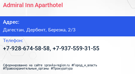 Admiral Inn Aparthotel по адресу Дагестан, Дербент, Березка, 2/3 в дальнейшем Организация, размещена в следующих категориях: