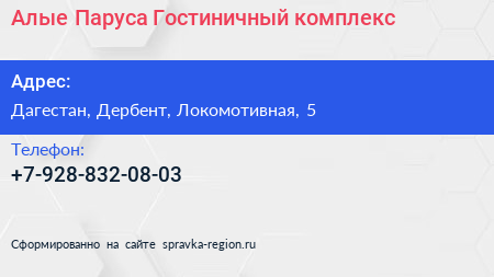 Алые Паруса, Гостиничный комплекс по адресу Дагестан, Дербент, Локомотивная, 5 в дальнейшем Организация, размещена в следующих категориях: