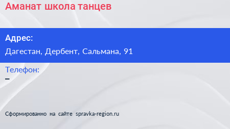 Аманат, школа танцев по адресу Дагестан, Дербент, Сальмана, 91 в дальнейшем Организация, размещена в следующих категориях: