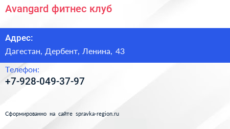 Avangard, фитнес клуб по адресу Дагестан, Дербент, Ленина, 43 в дальнейшем Организация, размещена в следующих категориях: