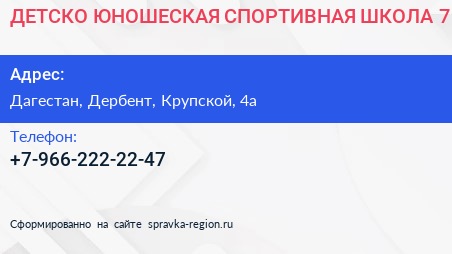 ДЕТСКО-ЮНОШЕСКАЯ СПОРТИВНАЯ ШКОЛА №7 по адресу Дагестан, Дербент, Крупской, 4а в дальнейшем Организация, размещена в следующих категориях: