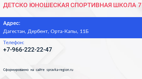 ДЕТСКО-ЮНОШЕСКАЯ СПОРТИВНАЯ ШКОЛА №7 по адресу Дагестан, Дербент, Орта-Капы, 11Б в дальнейшем Организация, размещена в следующих категориях: