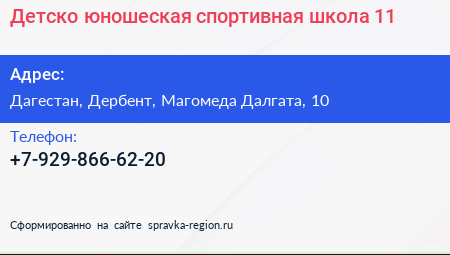 Детско-юношеская спортивная школа №11 по адресу Дагестан, Дербент, Магомеда Далгата, 10 в дальнейшем Организация, размещена в следующих категориях: