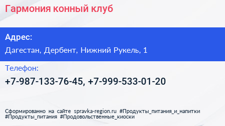 Гармония, конный клуб по адресу Дагестан, Дербент, Нижний Рукель, 1 в дальнейшем Организация, размещена в следующих категориях: